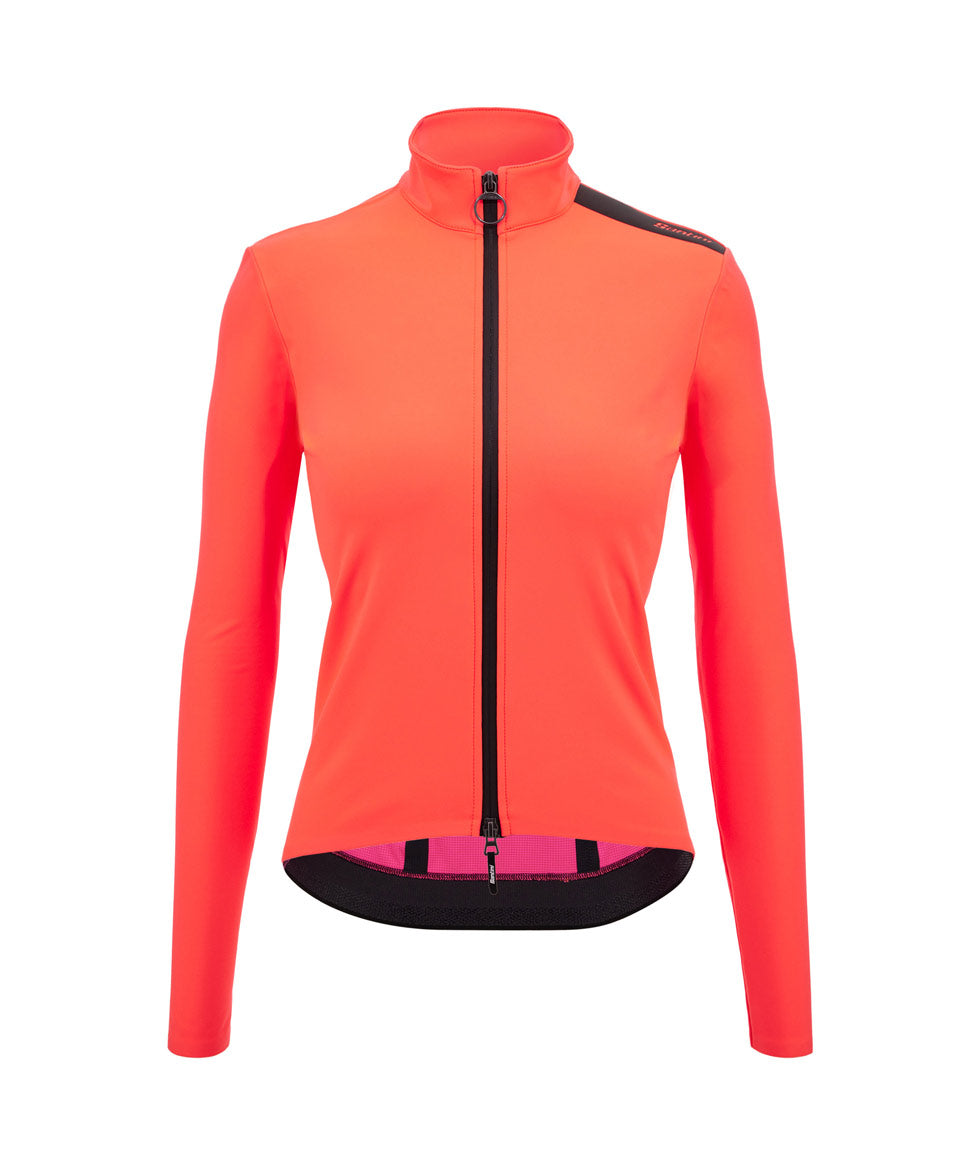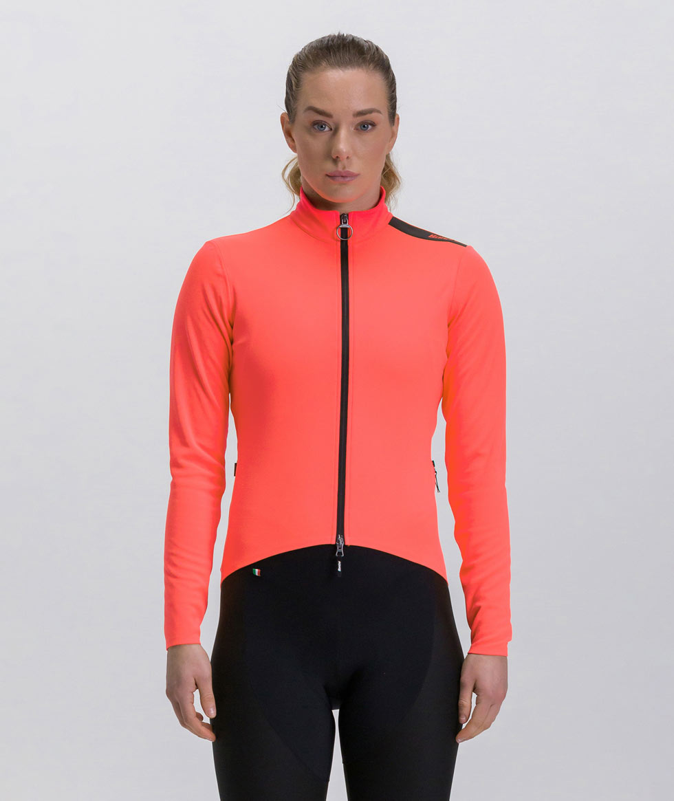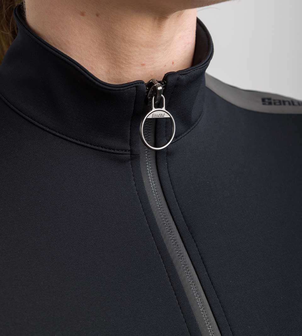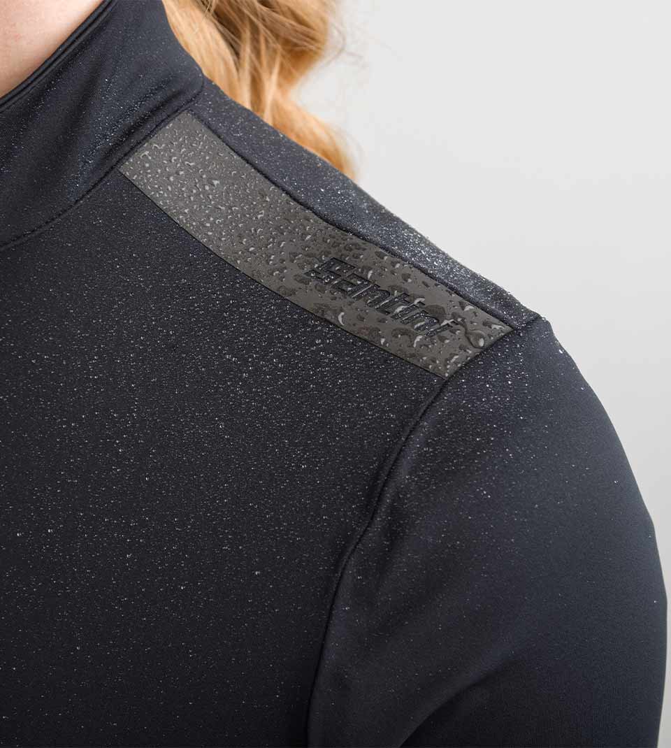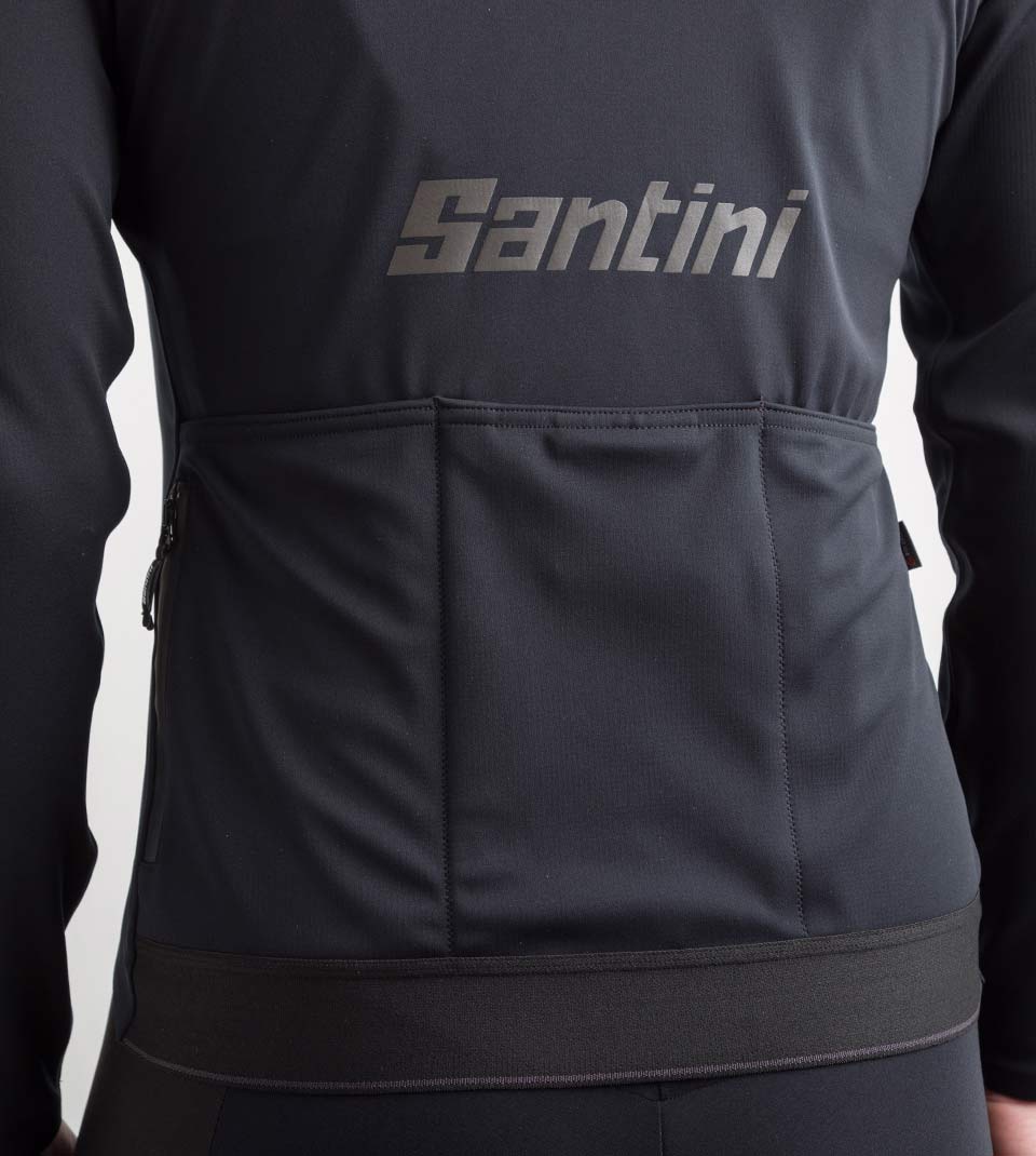The reflective shoulder strip and reflective Santini logo on the back ensure safety in low visibility.